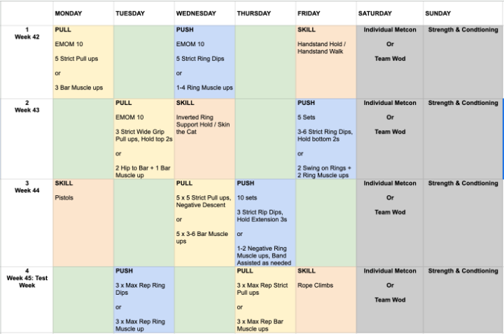 Athletes in this category likely already have strict pull-ups or dips and are developing consistency in bar or ring muscle-ups. For the pulling sessions, these athletes can choose to perform the strict pulling option or the bar muscle up option.